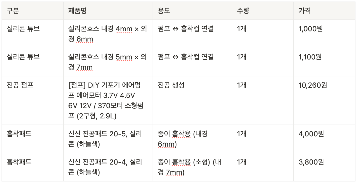 위 패키지가 8/6에 와서 이것도 주문은 해두고 그 전에도 하기 위해서 각 부품별 주문도 따로 했다. 접착력 제어가 잘 되면 좋겠다! 이 방식이 잘 동작하면 진공펌프는 모터 헙에, 실리콘 튜브는 리프트 암 안에, 마지막으로 리프트 암 팁을 현재 롤러에서 흡착패드로 변경할거다. 이건 배송이 금요일에 와서 금요일이나 토요일에 할 듯 싶다.