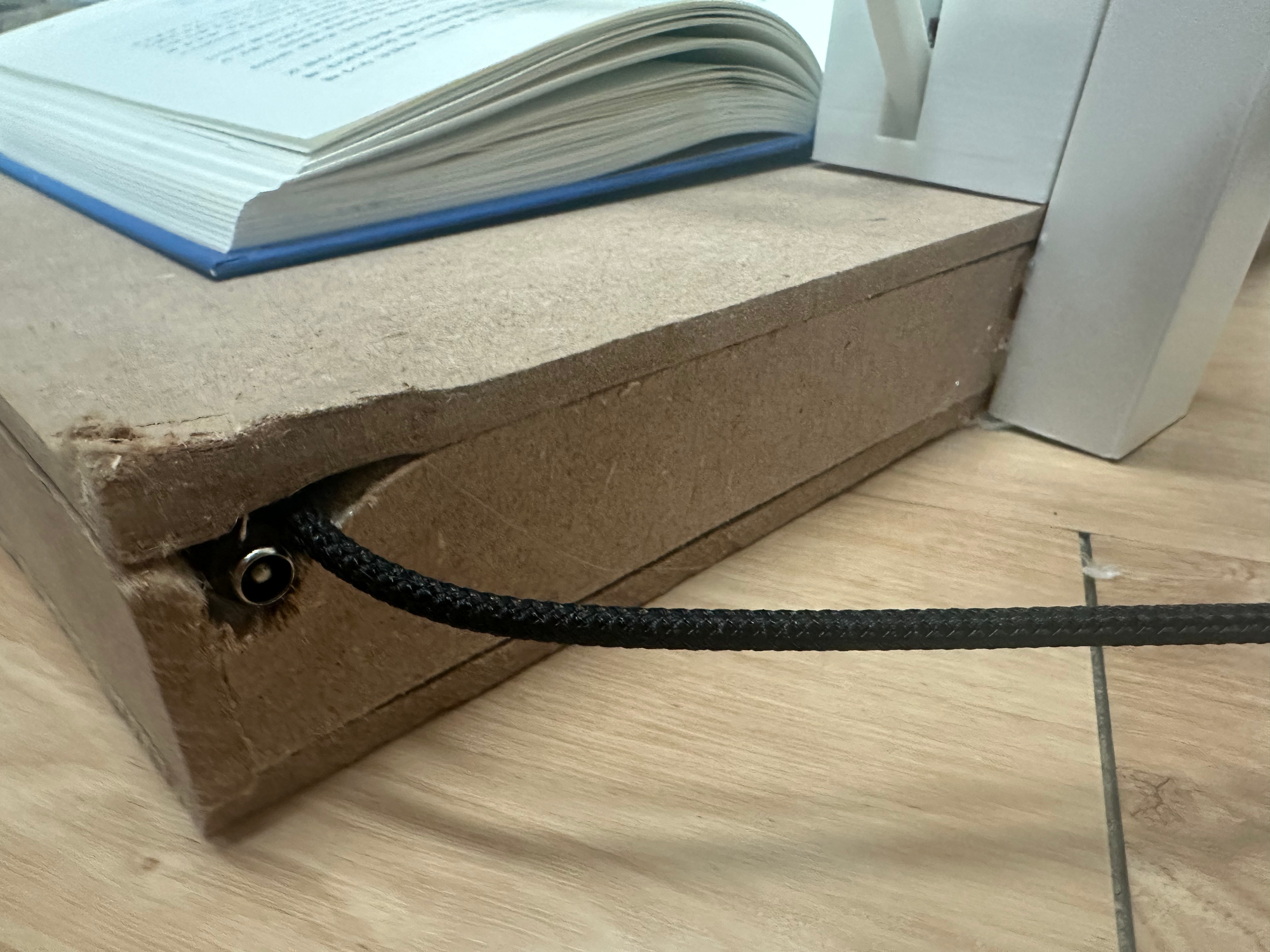 PVC 톱으로 열심히 쓱싹쓱싹하고, 플레이트도 톱질 + 사포로 5mm x 15mm 정도로 구멍 뚫어서 밖에서 봤을 때 딱 깔끔하게 연결했다. 플레이트랑 붙이는 건 글루건으로 붙였다. 잘 붙는다.