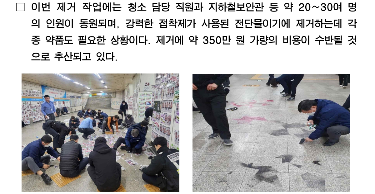 서울지하철은 총 280개가 있다고 한다. 지하철 역사 청소 인력은 1역당 4명 배치한다. 역당 월 평균 1,000만원 정도 청소에 투자한다고 하자.