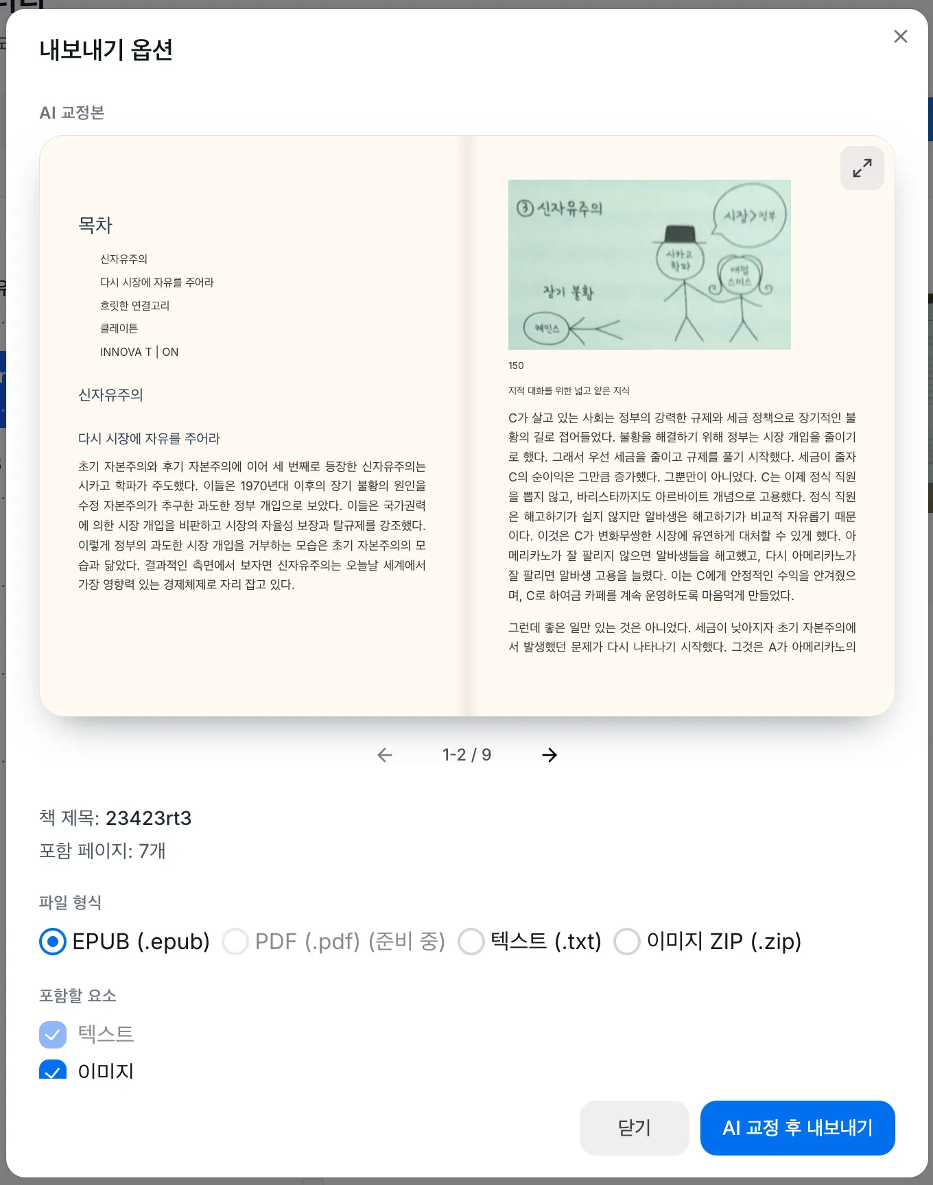 사진을 찍으면 Upstage Document Parsing으로 글자 인식 및 이미지, 테이블, 차트 인식을 한다. 추후 책 생성을 할 때 AI 교정을 하면 아래처럼 Document Parsing 결과를 기반으로 띄어쓰기나 오타 정도만 교정해주면서 쭉 책이 생성된다.