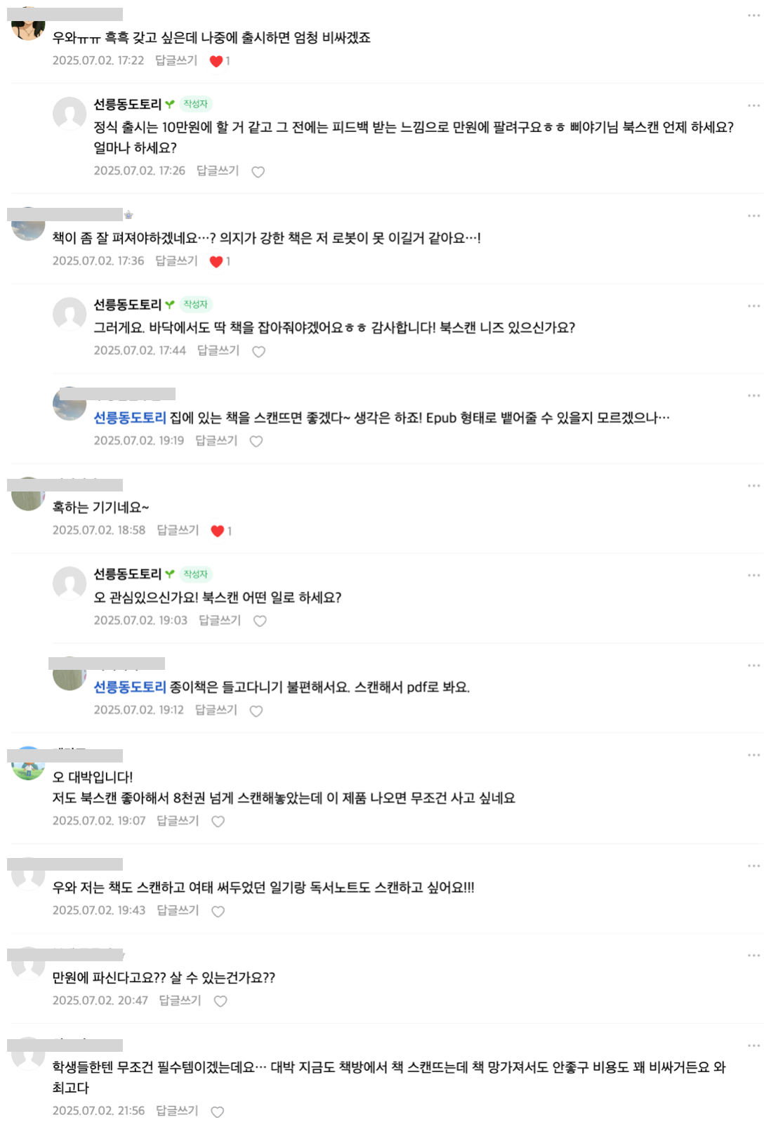 북스캔을 많이 하는 고객들이 모여있는 카페에서 뜨거운 반응을 얻었다.
