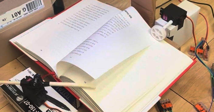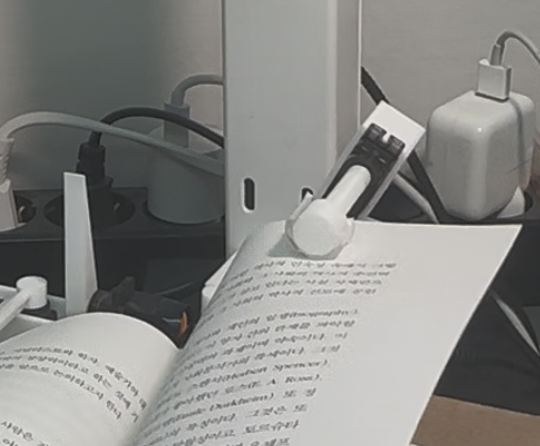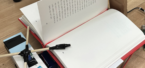 - 한 번에 10번 정도는 넘길 수 있게 되었고 책의 높이 조절을 더 이상 안해도 되었다. 모든 게 완벽하면 2-30장도 넘기지만 중간에 테이프에서 안 떨어지거나 홀드가 제대로 안 되거나 하는 문제가 꾸준히 발생했다. 홀드암의 홀드 힘이 약해 페이지를 많이 넘겼을 경우 원래대로 돌아와 덮이는 일도 많이 발생했다. 별도의 북홀더를 두고 10장마다 한번씩 고정시켜줘야 했다. 오른쪽은 마지막 50장은 매번 하나씩 북홀더로 고정해준다고 가상으로 intervention 횟수로 전환했다.