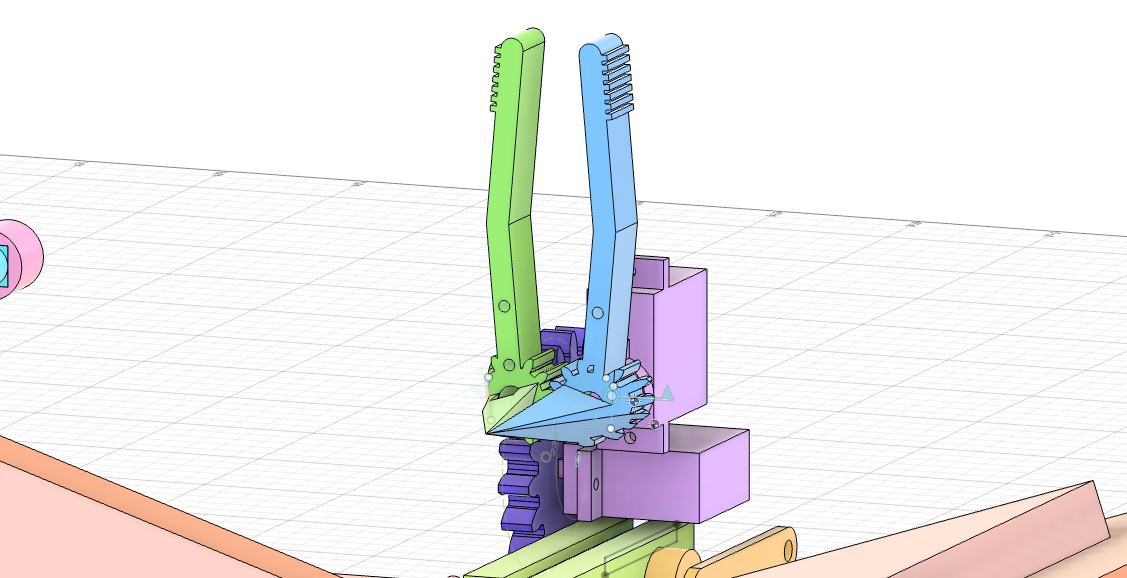 홀드암 하나로는 넘긴 페이지들이 다시 돌아오려는 복원력을 감당할 수 없었다. 힘의 방향과 모터의 방향이 직교하도록 홀드암을 바꾸고 직전에 넘긴 한 페이지를 누르는 프레스암을 추가하여 자유도 4가 되었다.
