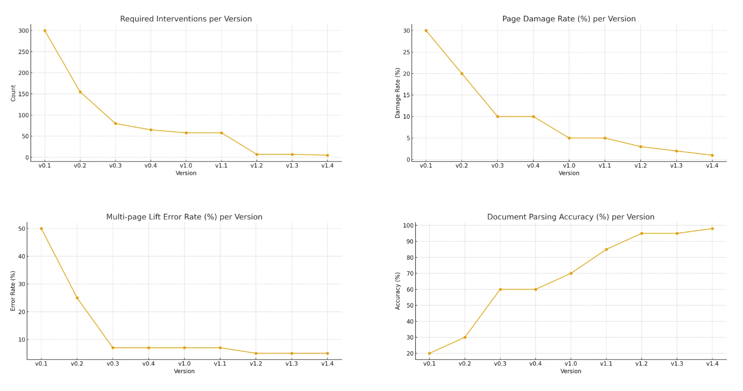 | Version | Required Interventions | Page Damage Rate | Multi-page Lift Error Rate | Document Parsing Accuracy |