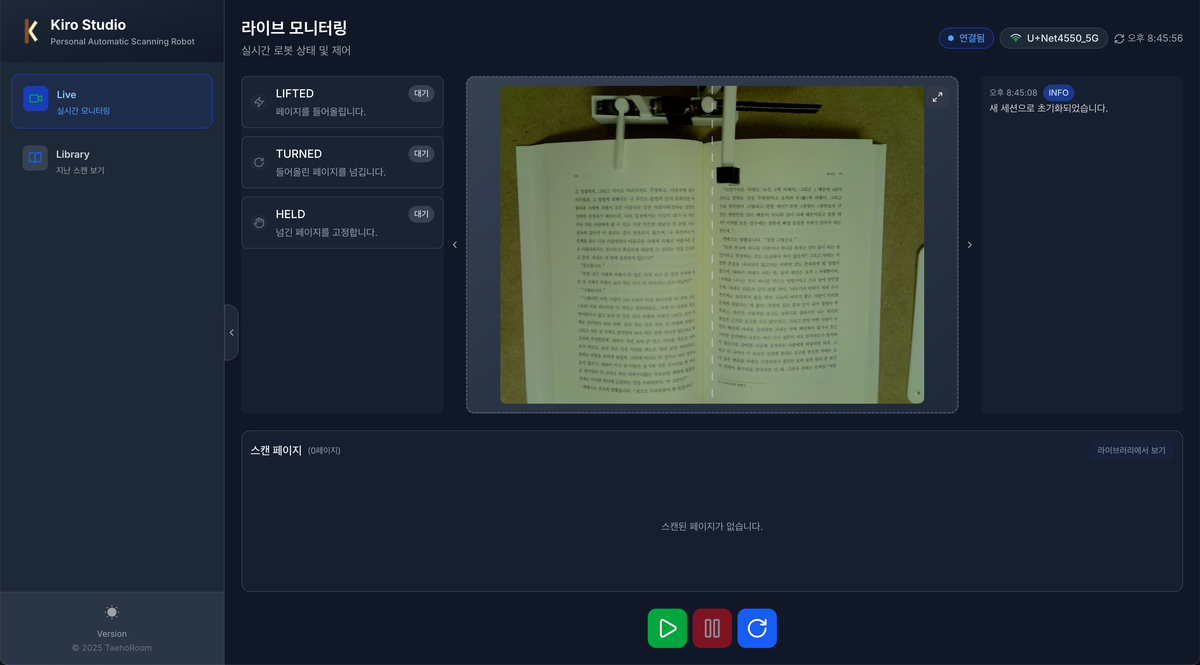 - 책을 양옆으로 눌러주는 V Press Arm이 생기고 책을 뒤집어서 스캔하는 역방향 스캔 모드가 생겼다. 역방향 스캔 모드로 인해 책의 마지막 부분을 하나씩 잡아주면서 스캔하는 것이 아니라 책을 뒤집어서 아예 뒤에서부터 다시 시작하는 방법으로 해결할 수 있었다.