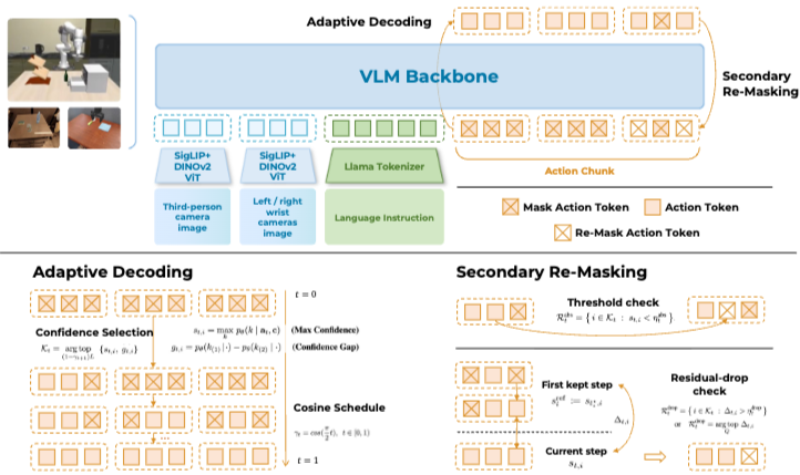 continuous diffusion은 AR보다 세련되게 움직일 수 있었지만 VLM backbone을 제대로 활용할 수 없었다. 이 장점들을 모두 살리고 단점은 가리기 위해 VLM backbone을 활용하여 discrete해지지만 diffusion으로 부드럽게 움직일 수 있도록 하는 discrete diffusion VLA를 제안한다.
