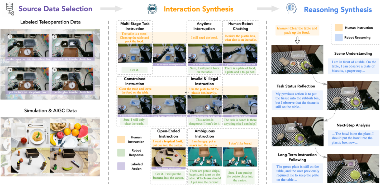 - Robix 시스템을 잘 만들었고 SFT 단계에서 data synthesis를 잘했다. Teleoperation하고 라벨링해서 labeled teleoperation data 모으고, 시뮬레이션이나 text-to-image로 합성. SOTA VLM으로 trace (사고 흐름) 가상으로 생성. 이것으로 Reasoning 학습.
